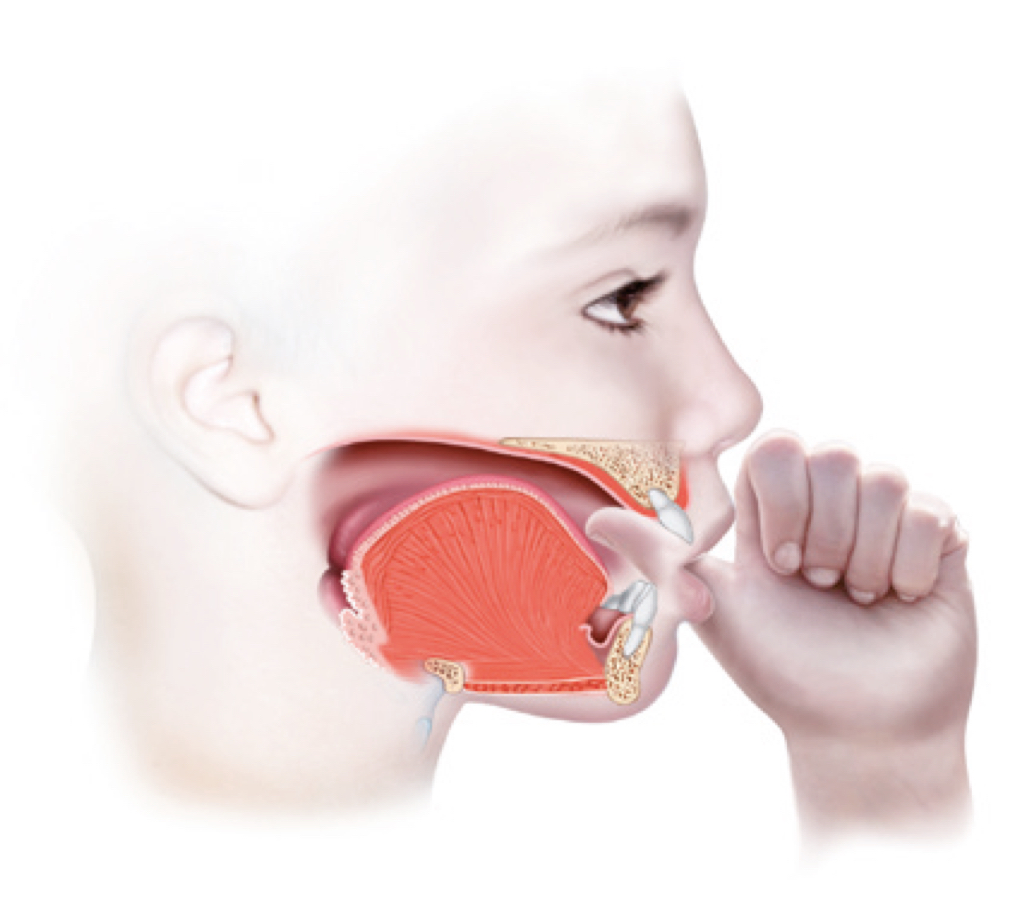 • Suzione: succhiare il dito, ma anche oggetti come il biberon, la tettarella, penne e matite non è una buona abitudine in quanto, oltre a interferire con il compito della lingua, può portare all’insorgere di cattive abitudini di suzione, e può concorrere alla protrusione (spinta in avanti) degli incisivi. (Fig. 3)